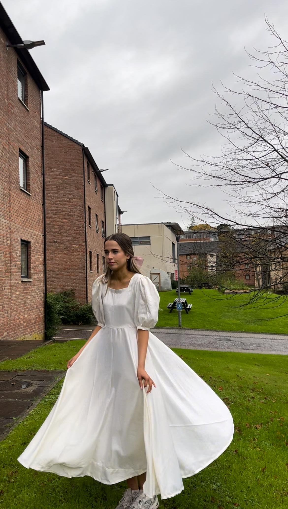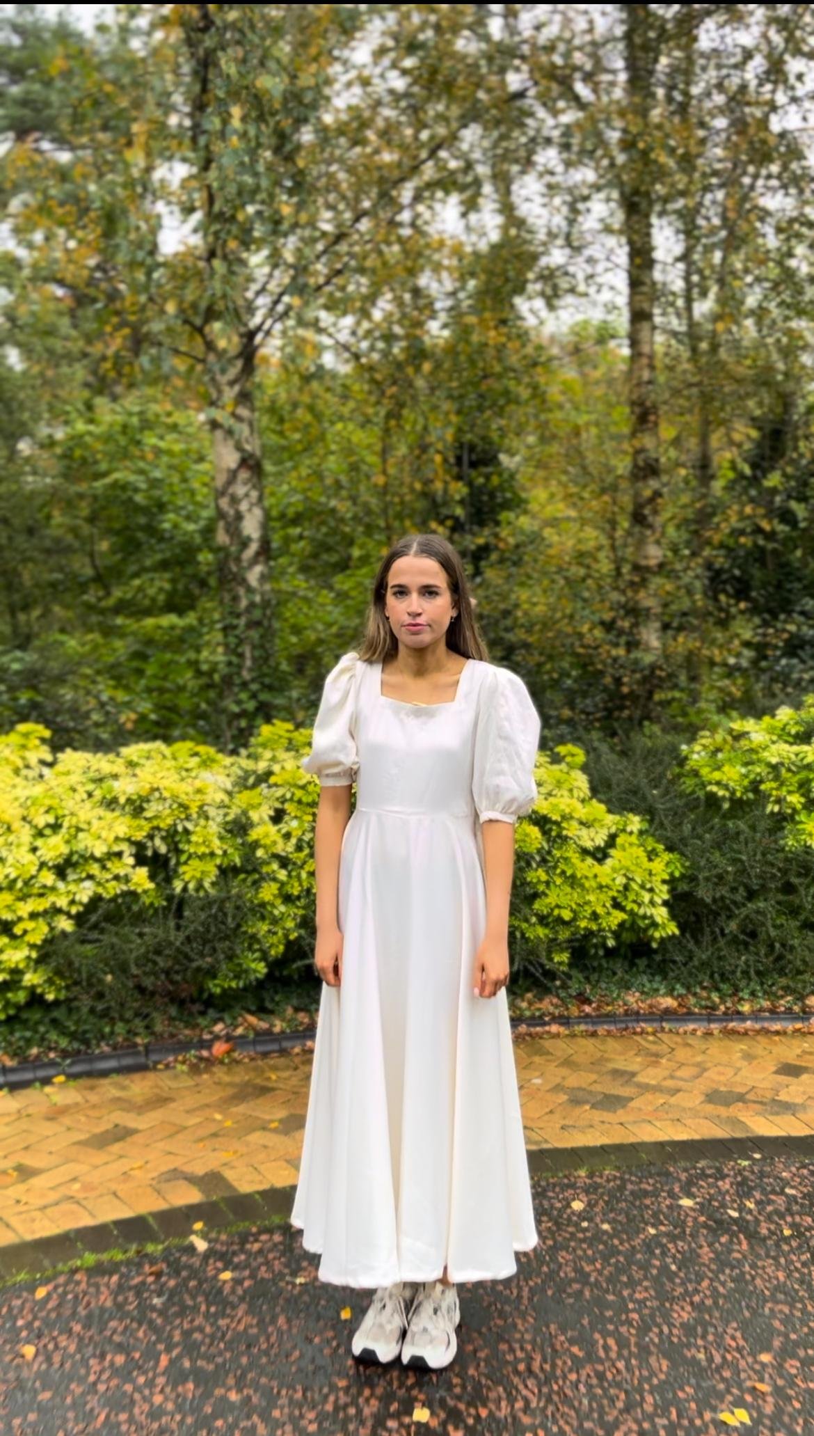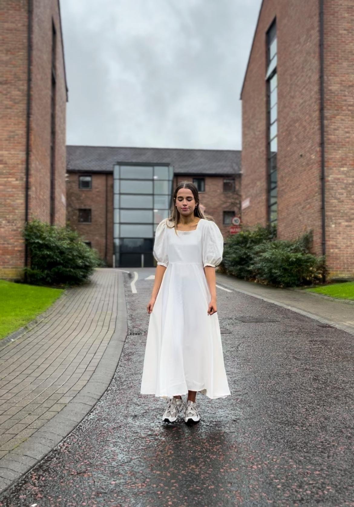 The Nova Dress balances structure and softness — a minimalist silhouette defined by its fitted bodice, gentle puff sleeves, and fluid skirt.